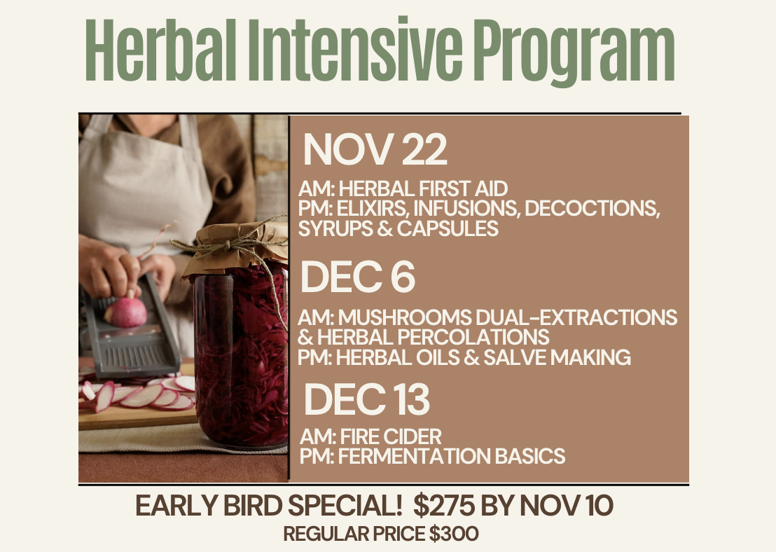 Ready to start or refresh your herbal education? Join us for the Herbal Intensive Program! Nov 22, Dec 6, and Dec 13.