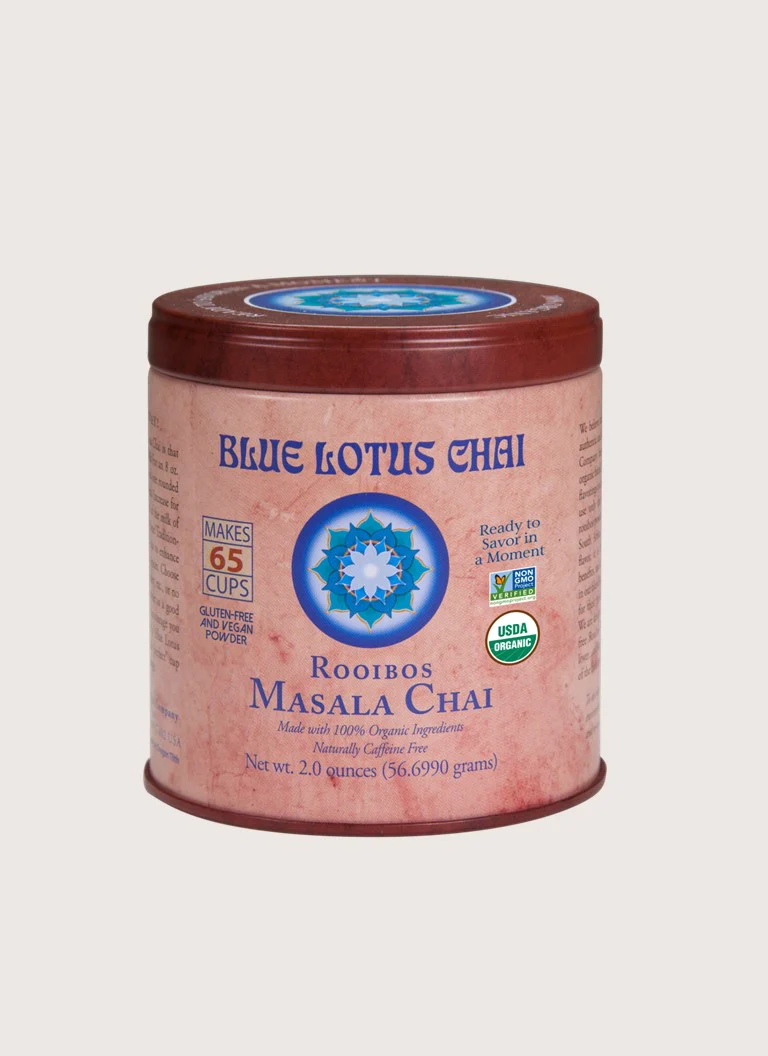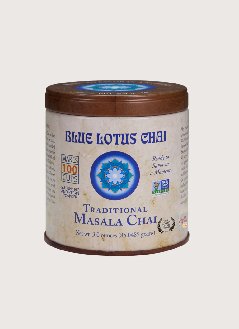 Blue Lotus Chai is unsweetened with no milk powders, artificial ingredients, or preservatives. Non-GMO Certified, Gluten Free, and Vegan.