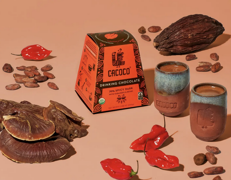 A delicious, spicy chocolate blend made with Habanero chilies and ancient adaptogenic Reishi mushroom! Ethically sourced, heirloom cacao is harvested from Ecuadorian farms applying ecological & regenerative practices. Drink cheers to the stewards of this wonderful elixir & relish the fact that your Cocoa is rebuilding the rainforest!