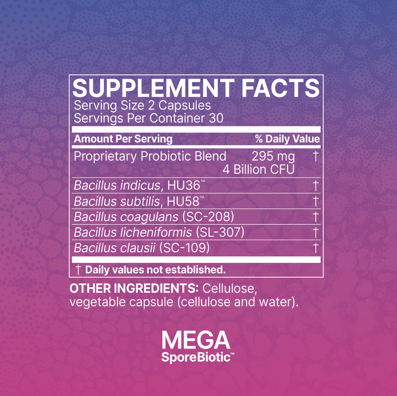 MegaSporeBiotic™ is a 100% spore-based, broad-spectrum probiotic clinically shown to maintain healthy gut barrier function. This unique all-spore formula effectively RECONDITIONS the gut by promoting microbial diversity and maintaining key health-promoting, commensal gut bacteria. MegaSporeBiotic™ boasts a 5-year shelf-life, does not require refrigeration, and maintains efficacy during antibiotic therapy.