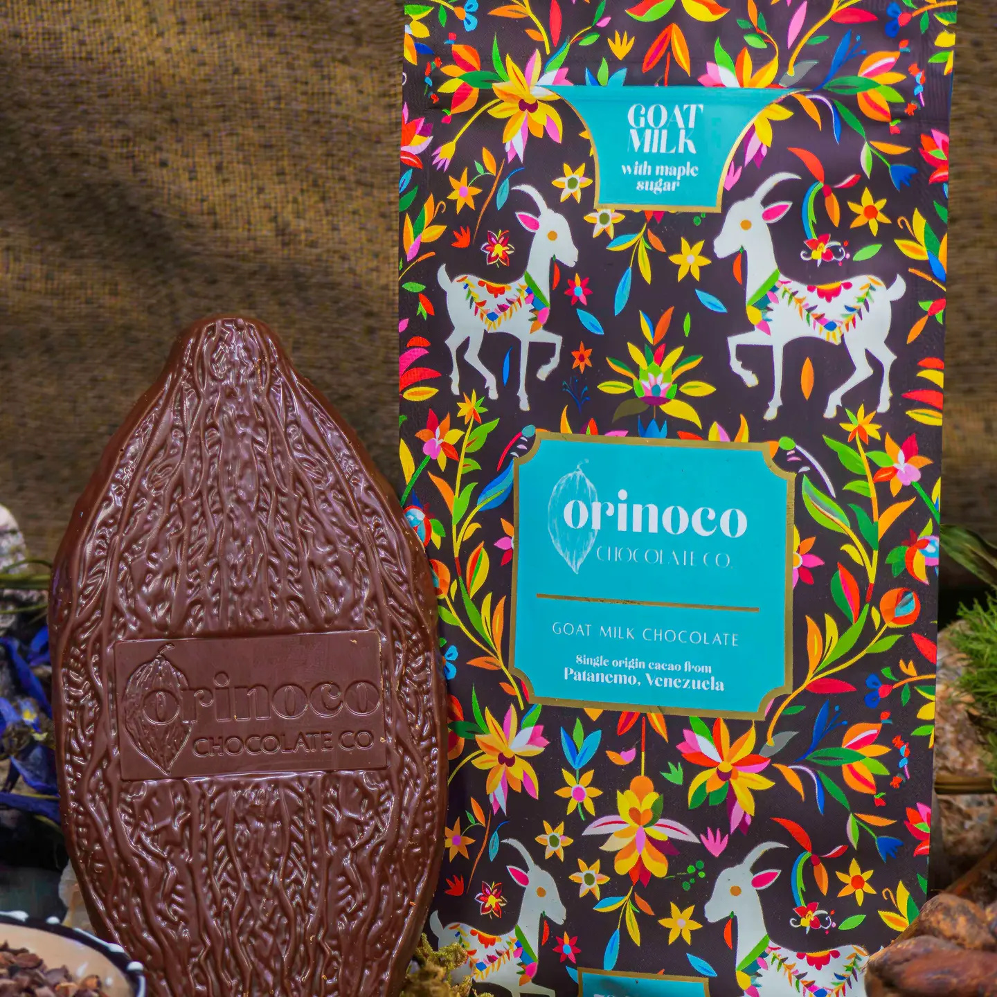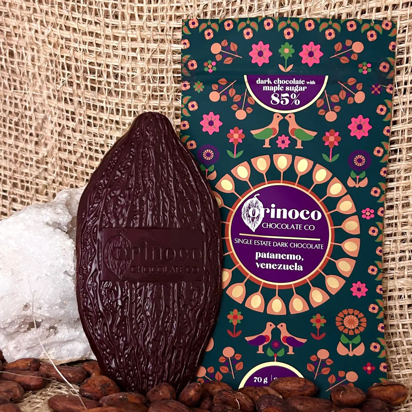 All natural, maple sugar chocolates from Orinoco Chocolate are luxurious and beautifully packaged for a special gift. Available in 85%, 70% and 50%. Made with only 3 -5 ingredients: cocoa beans, maple sugar, cocoa butter (Goat milk and Himalayan salt).